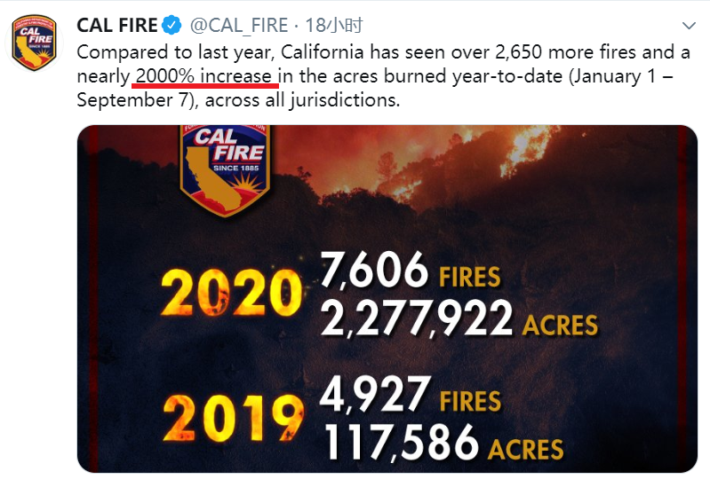 加州消防局在本周做了统计,截至9月7日,加州本年度山火毁灭面积同比增长2000%!