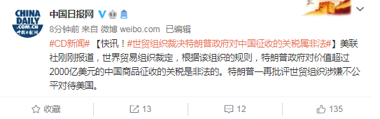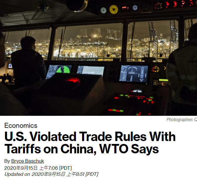 此外,今天WTO世界贸易组织裁定,根据该组织的规则,特朗普政府对价值超过2000亿美元的中国商品征收的关税是违规的。