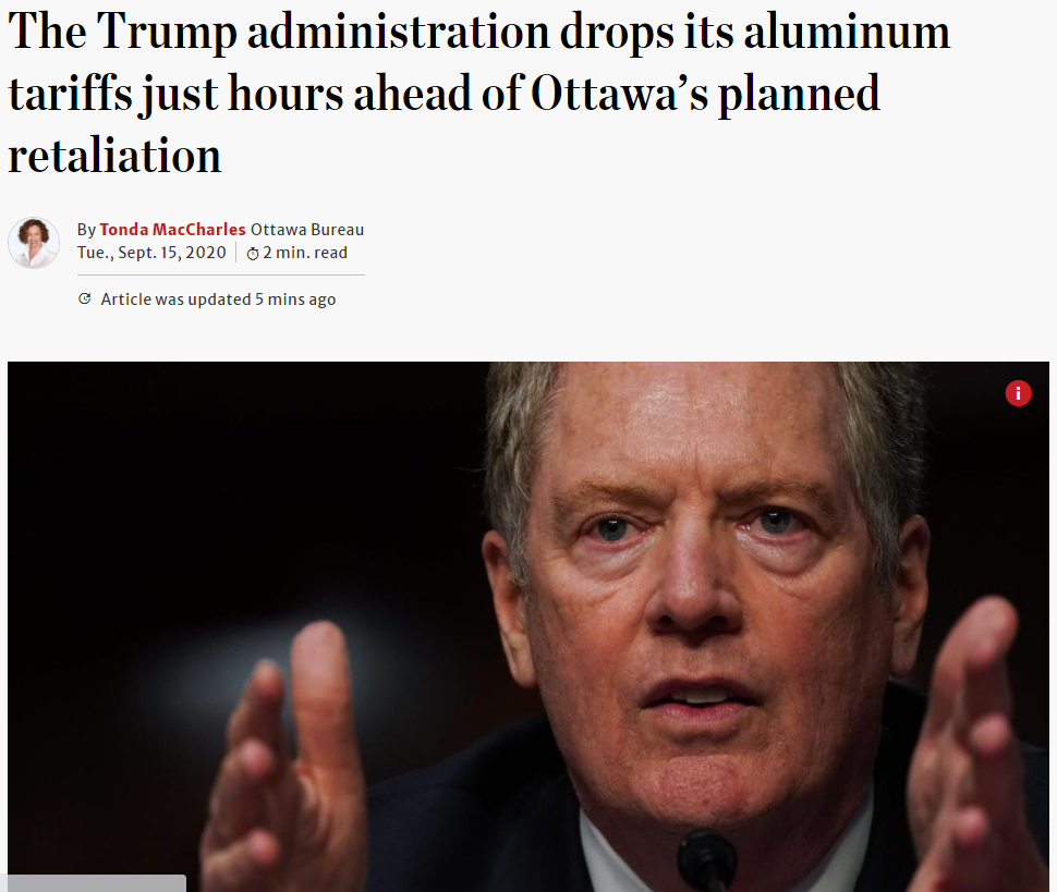就在加拿大准备公布其报复措施前几个小时,美国贸易代表办公室宣布一重大举措:美国已经取消了对加拿大铝的10%的关税,追溯到9月1日。