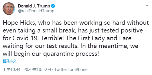 川普推文写道:今晚,夫人与我被验出2019冠状病毒疾病(COVID-19)阳性。