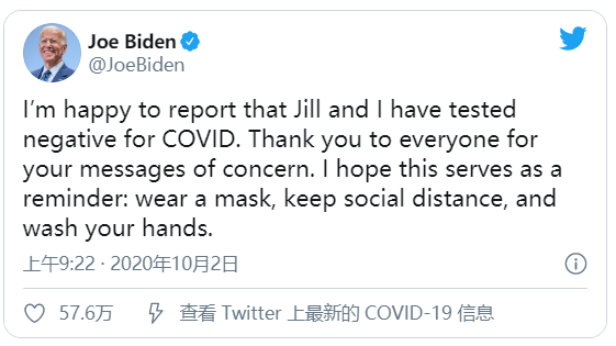 拜登虽然日前刚和川普在同一房间内辩论,但险险逃过一劫,刚刚和妻子都拿到了新冠阴性报告。