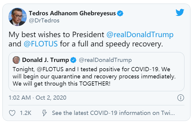 WHO世卫总干事谭德赛也为川普夫妇送上祝福。