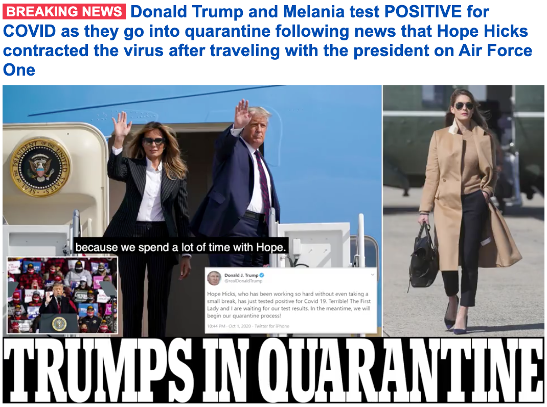 2020年10月2日凌晨0时54分(美国东部时间),74岁美国总统特朗普宣布,自己和夫人梅拉尼娅确诊感染新冠,将立刻开始隔离与治疗进程。