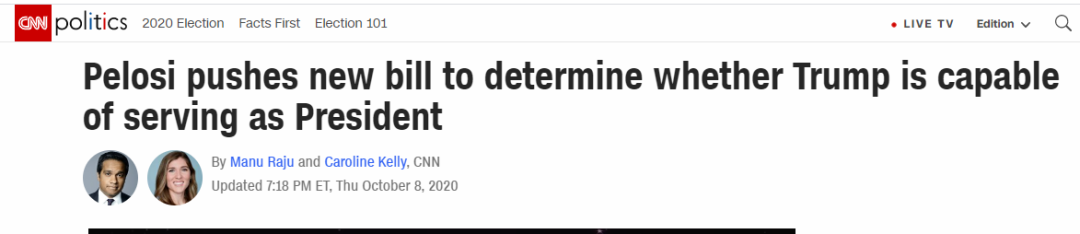 众院议长佩洛西(Nancy Pelosi)质疑川普总统在确诊新冠肺炎后的任职资格,8日宣布将提案成立委员会,以允许国会依宪法第25条修正案进行干预和免除总统行政职务。