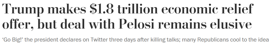 川普当时说,佩洛西提出要2.4万亿美元去帮助一些犯罪高的州,这和新冠疫情完全无关,但共和党提出的1.6万亿美元又被佩洛西拒绝。协商一度陷入僵局。