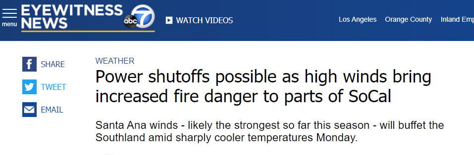 受大风和火灾影响,南加州地区的电力公司准备轮流停电,可能会影响六个县的12万名客户。