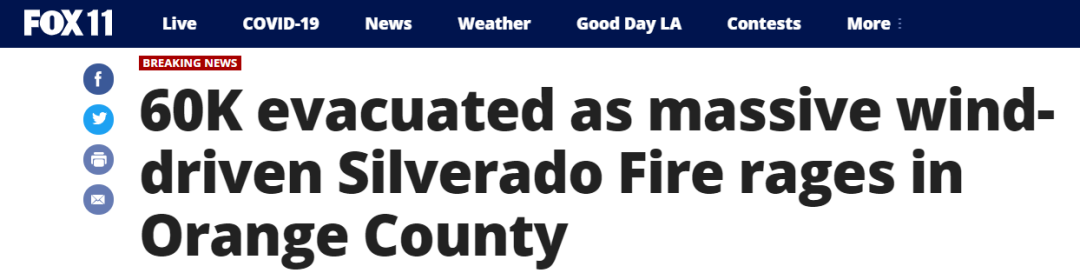 从昨夜开始,一场异常干燥的大风袭击了南加州,在尔湾地区引发了一场2000英亩的大火,导致当地6万居民紧急疏散!