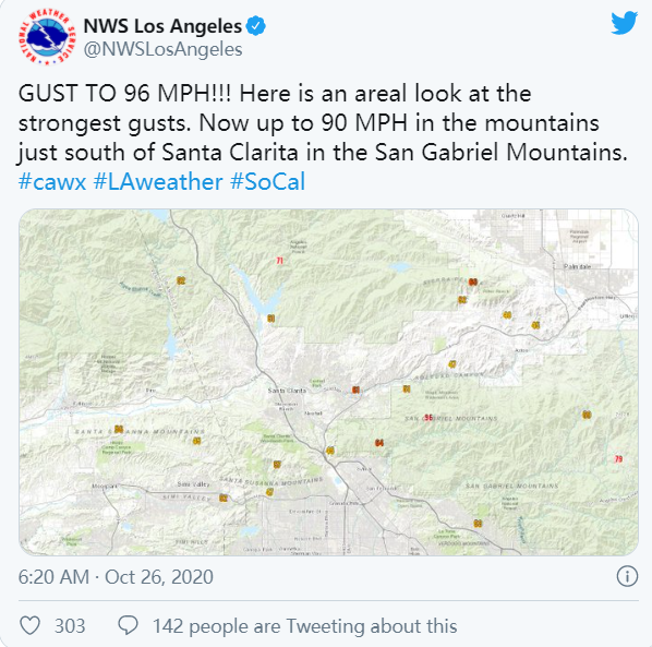 图:大风最高时速96英里 (来源:NWS Los angeles)