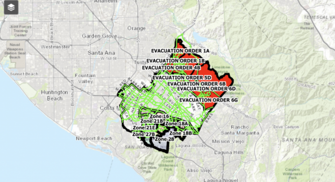 据加州林业和消防局称,截至上午10点,大火烧毁的土地面积达2000多英亩,并对尔湾市约6万名居民发出了强制撤离令,其中包括尔湾大道(Irvine Boulevard)以北的贝克公园路(Bake Parkway)和詹博里路(Jamboree Road)之间的所有居民。到目前为止,仍然没有任何关于起火的消息。