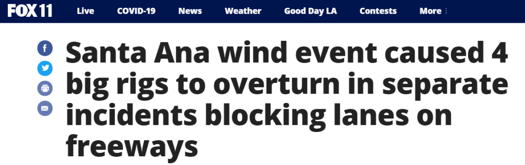 大风席卷洛杉矶 高速公路发生4起卡车翻车事故