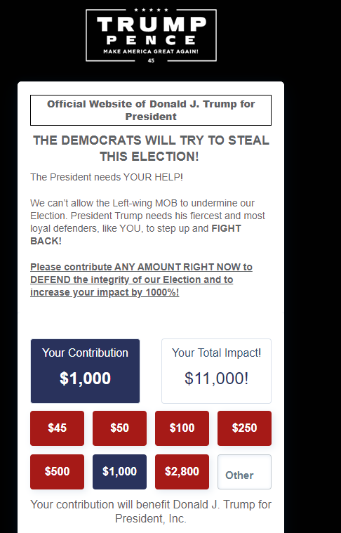 据悉目前川普正在紧急筹款,准备某些州的验票。毕竟,再美国大选中,想要重新验票,是需要不少银子的。