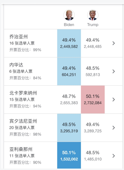 乔治亚:而仅在3小时前,拜登在佐治亚州得票也反超特朗普, 截止发稿前,拜登领先特朗普0.02%,共计1096票。