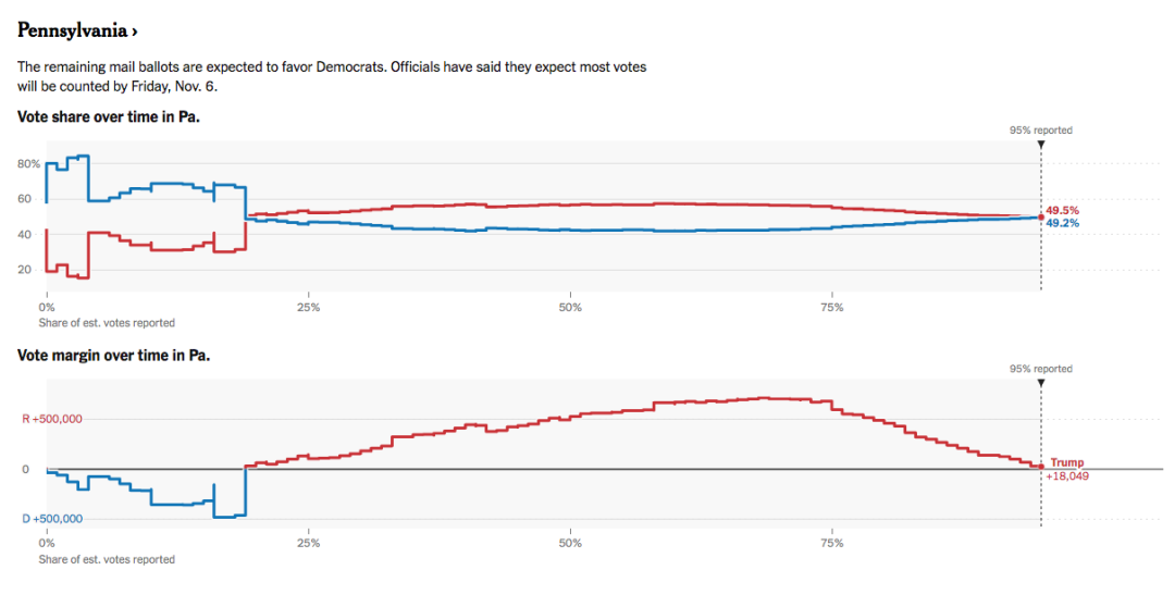 宾州:在由民主党人作州长执掌的宾夕法尼亚州,开票以来,特朗普的优势逐渐缩小,截止6日早晨美东时间6点前,仅领先拜登0.3个百分点,18,049票,