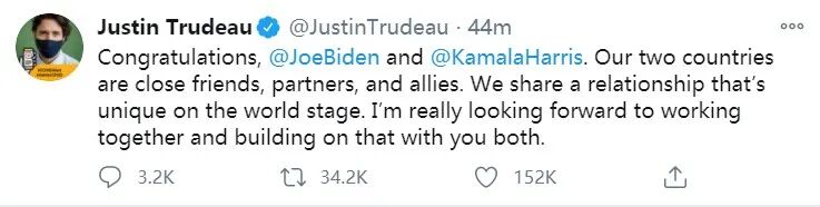 拜登赢了!当选美国第46届总统!川普拒接受!加拿大总理...