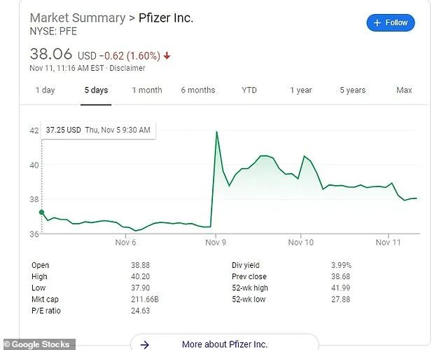 要知道,在周一公开宣布疫苗能阻止90%的新冠传播后,辉瑞公司的股价瞬间暴涨15%,达到了41.99美元,这是辉瑞一年以来的股价最高点。而辉瑞的CEO,就在这个最高点,卖掉了自己62%的股票。