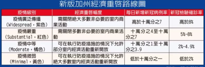 州长纽森(Gavin Newsom)于16日的疫情简报会上宣布,由于疫情急剧恶化,全加州58个县当中,33个县在州府的「更安全经济蓝图」上出现倒退,一些县甚至不止倒退一个层级。