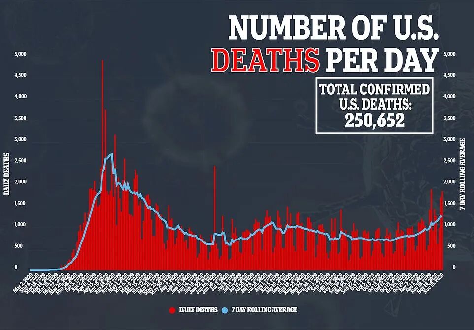 周四,每日死亡人数飙升至1800人,过去一周平均每天死亡人数为1200人,为数月来的最高图源:每日邮报
