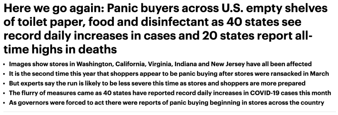 根据《每日邮报》报道,华盛顿、加利福尼亚、弗吉尼亚、印第安纳、俄亥俄、新泽西、纽约、密歇根和密苏里的商店都受到了恐慌性抢购的影响。