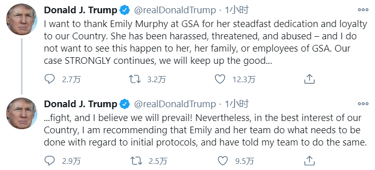 川普也发布推特,亲口感谢联邦总署的工作,并确认开始权力过渡的决定。