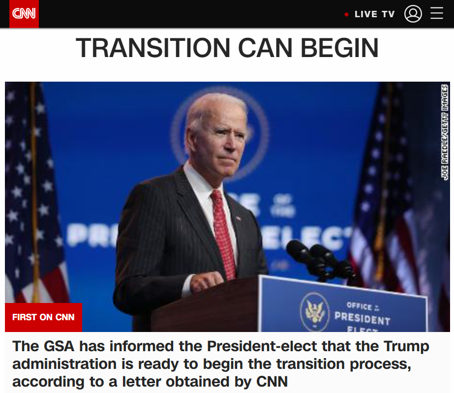 美国联邦总务署(General Services Administration,简称GSA)已经通知当选总统拜登,川普政府已经准备好开始正式权力交接程序。