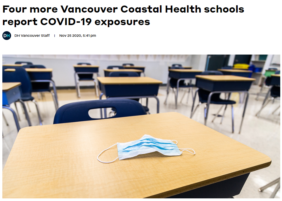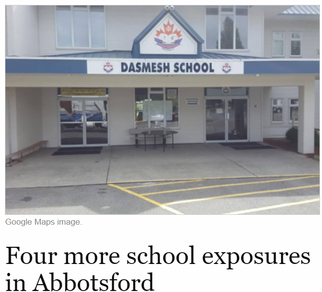 Dasmesh Punjabi School,病毒暴露时间11月17日至19日; St. John Brebeuf Regional Secondary,病毒暴露时间11月17日; Rick Hansen Secondary,病毒暴露时间11月17日; WJ Mount Secondary,病毒暴露时间11月17日;