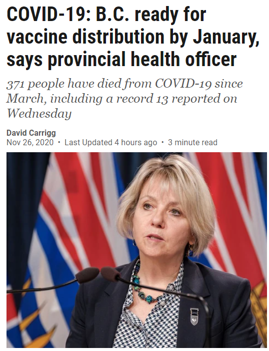 在更新本省疫情数据的同时,亨利也表示,BC省有望在2021年1月份之前收到辉瑞和Moderna疫苗,并进行分发。