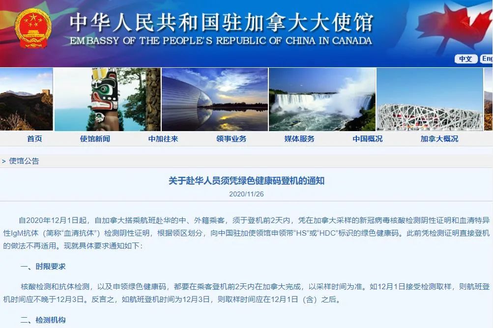 大使馆发布《关于赴华人员须凭绿色健康码登机的通知》,明确表示,自2020年12月1日起,自加拿大搭乘航班赴华的中、外籍乘客,须于登机前2天内,凭在加拿大采样的新冠病毒核酸检测阴性证明和血清特异性IgM抗体(简称“血清抗体”)检测阴性证明,根据领区划分,向中国驻加使领馆申领带“HS”或“HDC”标识的绿色健康码。