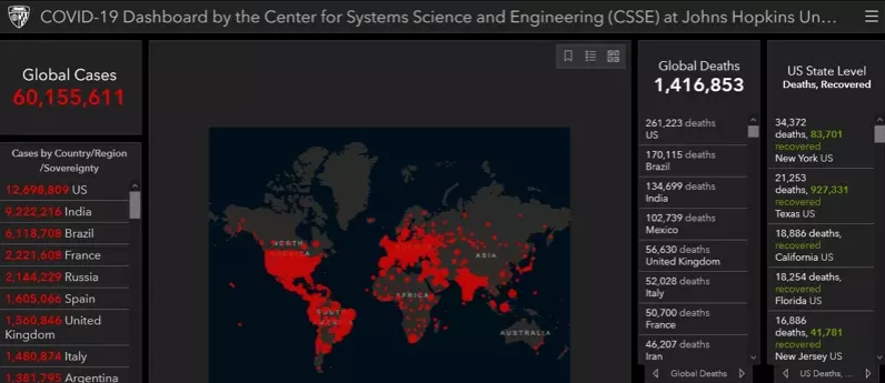 2020的确举步维艰,新冠疫情肆虐全球,根据约翰霍普金斯大学统计的结果显示,截至美东时间25日下午4时为止,全球2019冠状病毒疾病(COVID-19,新冠肺炎)累计确诊数已突破6000万例。