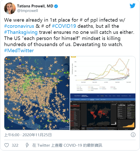 美国约翰霍普金斯大学医学院的普洛威尔(Tatiana Prowell)博士推文分享全美上空的图片,布满大量黄色标示,每个黄色标示都代表一架飞机,并指美国确诊数和病故人数都位居全球第一,但大批人仍要在感恩节出游,「美国人只顾自己的心态,害死我们数十万人。惨不忍睹!」。
