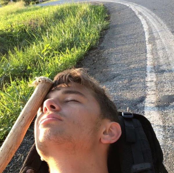 有一次,当他准备在人行道上过夜时,他对自己3600名Ins粉丝开玩笑道“这是我住过最大的房间,祝大家好梦”。