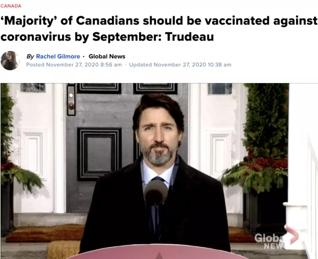 此前加拿大联邦政府官员称在2021年初,将有300万加拿大人(主要为易感染群体、一线工作者等优先人群)能接种疫苗;而总理特鲁多也表示,在明年9月前有望为大部分加拿大人接种疫苗。