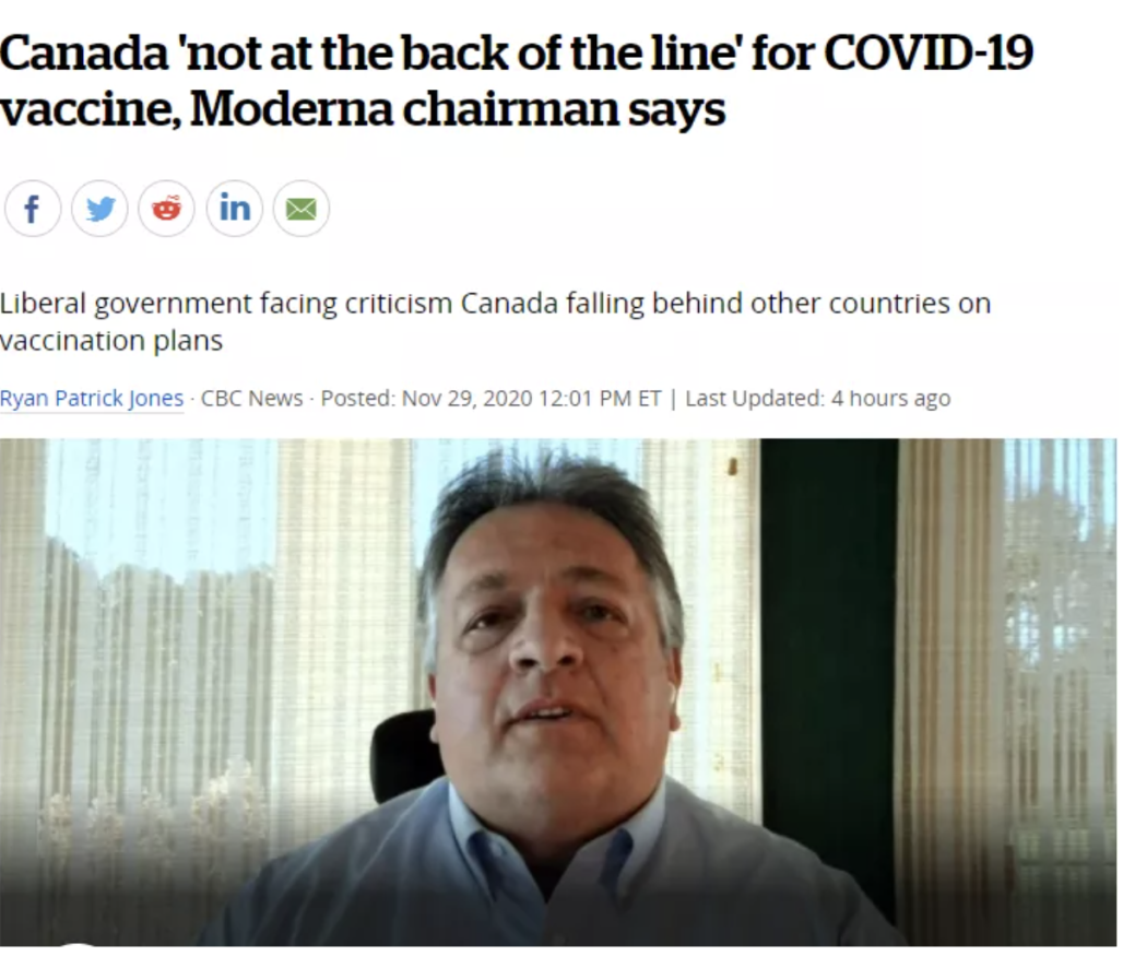 Moderna公司董事长努巴·阿费扬(Noubar Afeyan)也在周日(29日)表示,加拿大将是最早收到Moderna疫苗的国家之一!