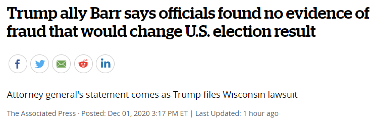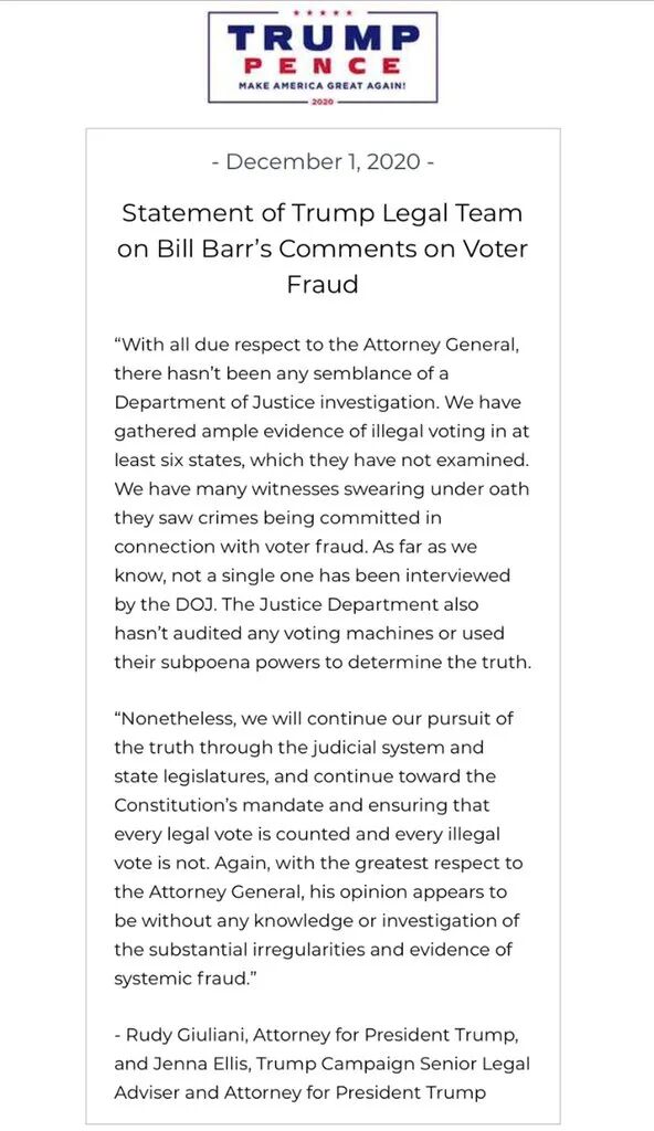 美司法部长:无证据显示总统大选欺诈,川普团队发声明...