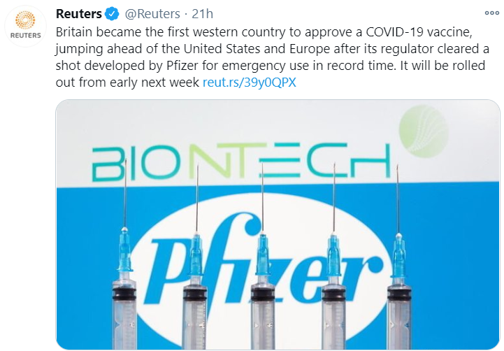 英国成为世界上第一个批准辉瑞/BioNTech COVID-19疫苗广泛使用的国家。