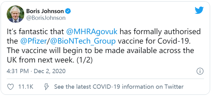 英国首相鲍里斯·约翰逊称赞英国医药局的批准是一场全球性胜利,是疫情结束的一线希望。
