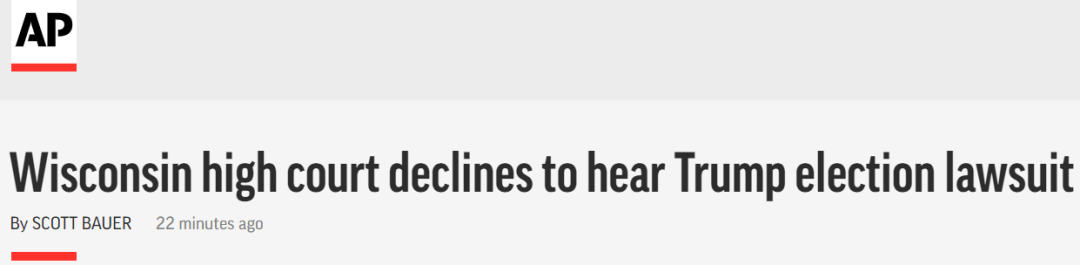 就在刚刚,威斯康星州最高法院决定,拒绝听取川普的选举诉讼,这是川普在全国法庭战场上的最新败果。