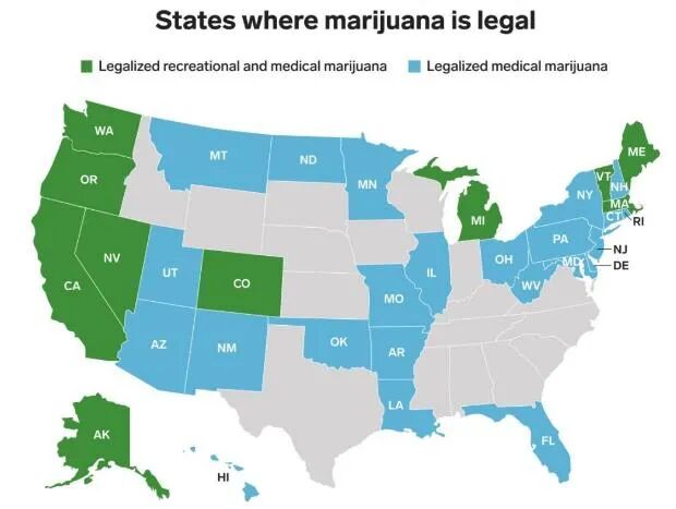 目前“大麻合法化”的州越来越多,现在美国已经有15个州及华盛顿特区批准用于娱乐用大麻个人使用:阿拉斯加州、亚利桑那州、加利福尼亚州、科罗拉多州、华盛顿特区、伊利诺伊州、缅因州、马萨诸塞州、密歇根州、蒙大拿州、新泽西州、内华达州、俄勒冈州、南达科他州、佛蒙特州、华盛顿州。