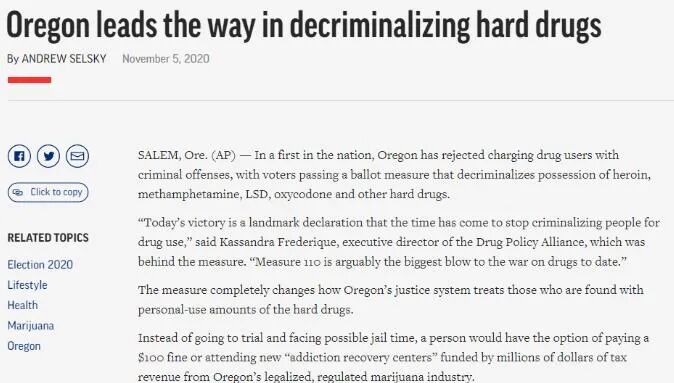 俄勒冈州 俄勒冈州成功通过了两项法案:“109法案”将使裸盖菇素(又称“神奇蘑菇”)的医疗使用合法化,超过55%的民众支持;“110法案”则将海洛因、可卡因和病毒等“硬性毒品”合法化,获得近59%的民众支持,该法案通过后,持有少量海洛因、可卡因等在俄勒冈州将不再是犯罪,但制毒、贩毒及吸毒后驾驶,仍属刑事犯罪。
