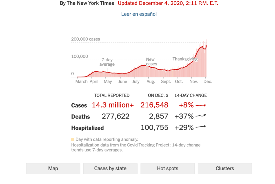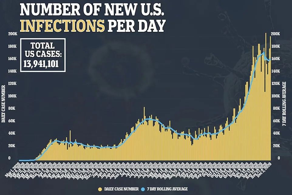 12月3日,美国当天新增确诊人数突破历史新高,达到21.7万。