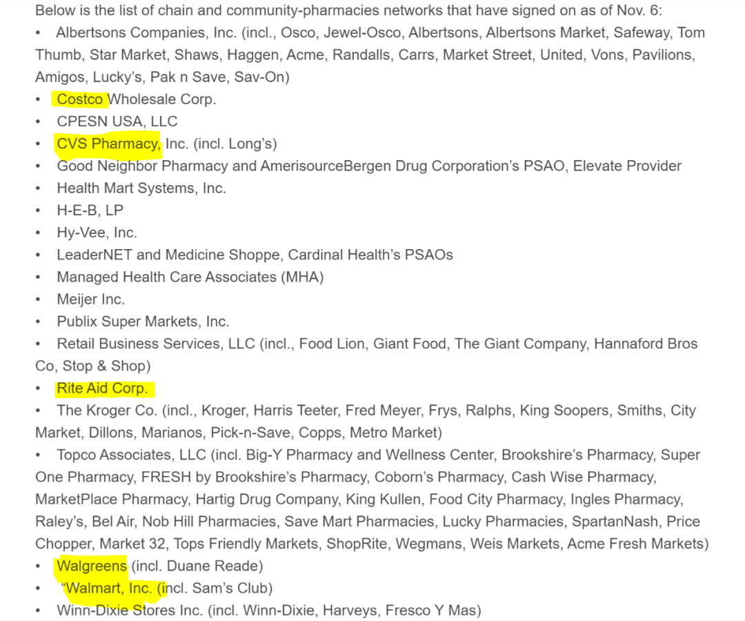 以下是截至11月6日已签署的连锁和社区药房网络的列表: