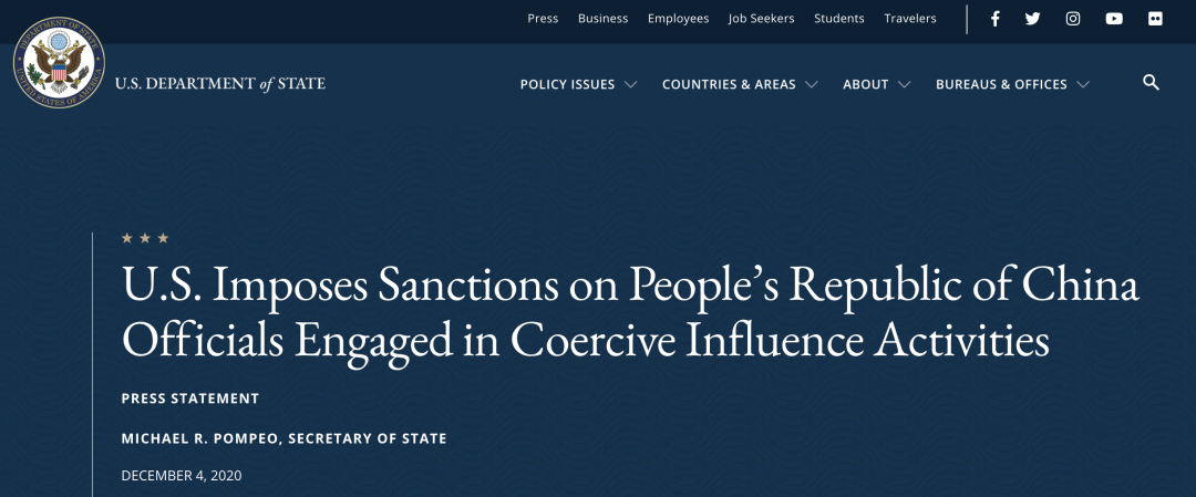12月4日 蓬佩奥又进一步宣布, 将对参与海外影响力行动的中国公民实施签证限制!