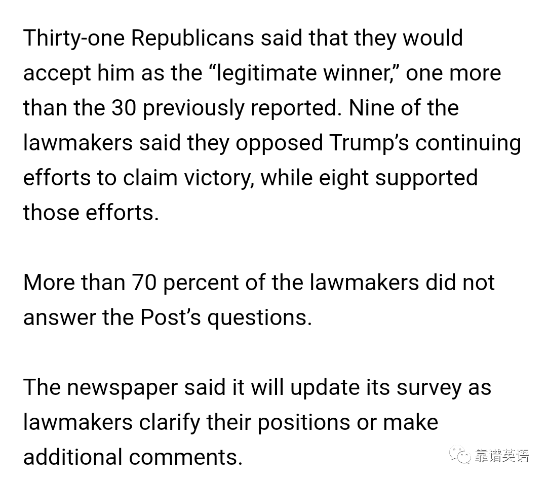 31名共和党人表示,他们将接受拜登为“合法胜利者”,比此前报道的30人多出一人。9名共和党议员表示,他们反对川谱继续宣称他才是胜利者的努力,而有8名共和党议员支持他的这些努力。