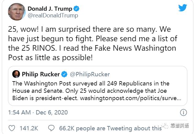 最新调查称仅25名共和党议员承认拜登胜选,川谱反应还是原来的川建国