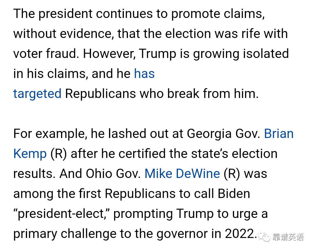 例如,在佐治亚州州长布莱恩·坎普(BrianKemp)确认了该州的总统选举结果后,他猛烈抨击了这位共和党州长。而俄亥俄州共和党州长迈克·德文(Mike DeWine)是最先表态承认拜登为当选总统的共和党人,这让川谱很生气,他随后呼吁共和党人在2022年州长初选中向德文发起挑战。