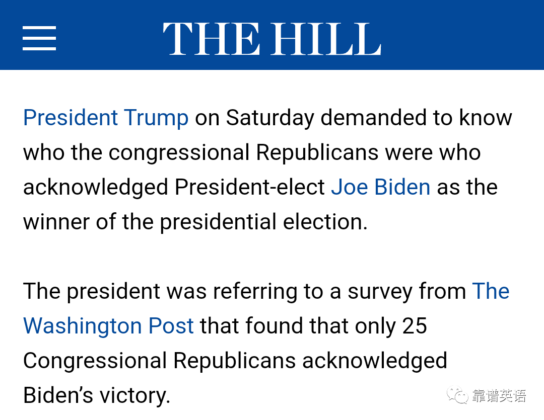 川谱总统回应的是《华盛顿邮报》的一项调查,该调查指仅有25名国会共和党人承认拜登为大选获胜者。