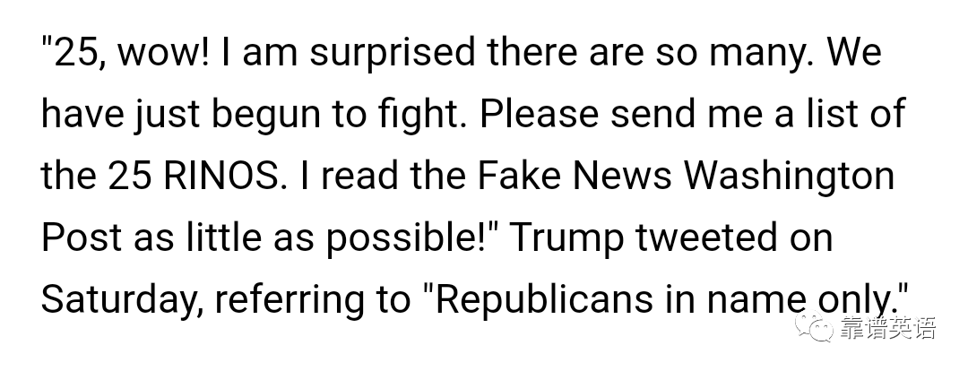 “25人,哇!我很惊讶竟有这么多。我们的战斗才刚刚开始。请给我一份25名共和党人名单。我会尽可能的少看假新闻《华盛顿邮报》!”川谱周六在推特上写道,RINO指的是“名义上的共和党人”(含有贬义,指的是虽然是共和党人,但是保守倾向达不到共和党人的标准)。