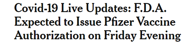 纽约时报消息,美国食品和药品监督局(FDA)今晚,将对辉瑞疫苗进行紧急授权!