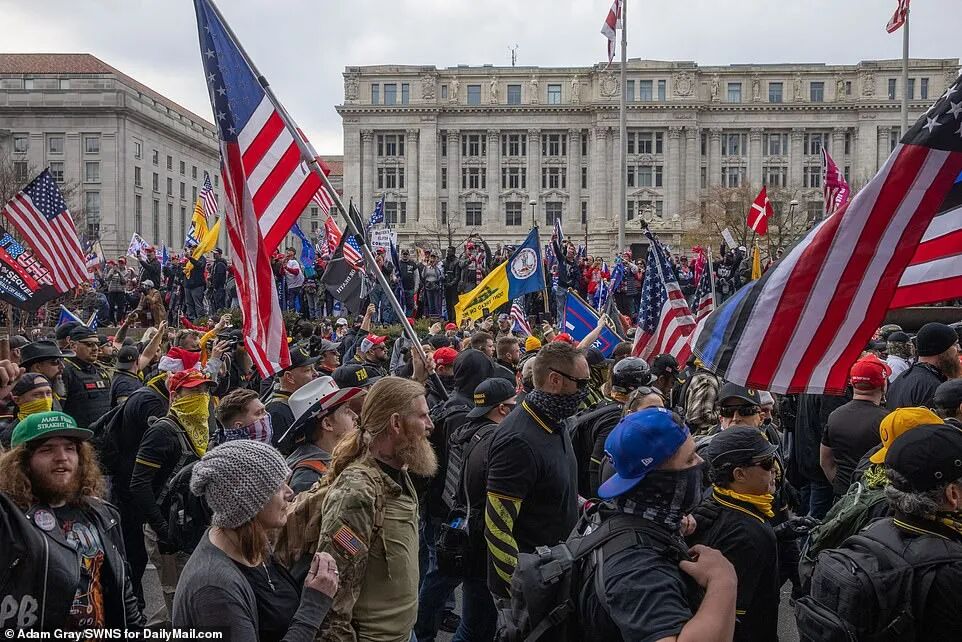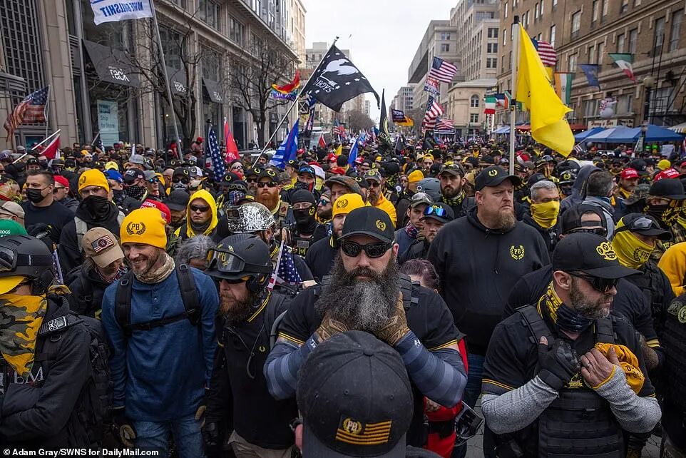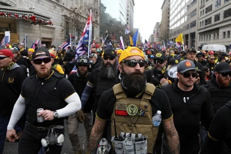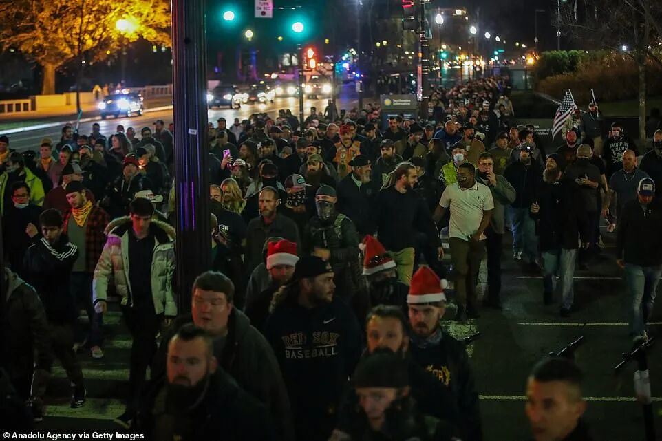 200多名极右组织成员骄傲男孩也参加了本次游行抗议,他们穿着防弹衣,带着墨镜,在人群中十分醒目。