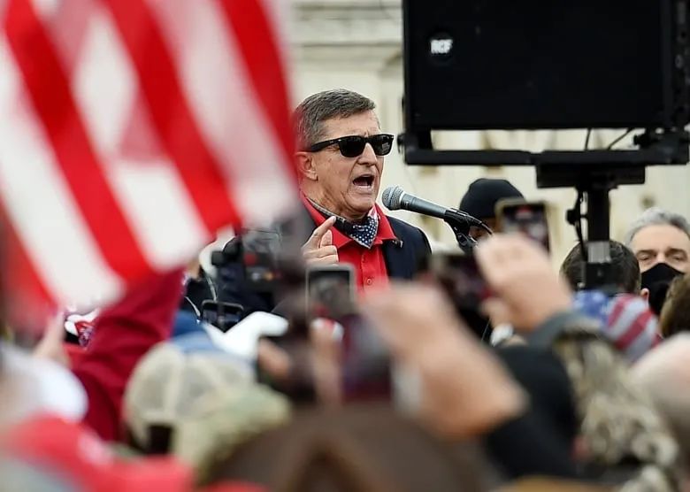 两度在通俄案调查中认罪的退役陆军将领佛林,站在最高法院的台阶上发表谈话。