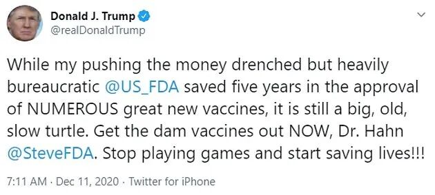 他在推特上发飙,称FDA处理疫苗时就像一只“庞大而缓慢的老乌龟”。